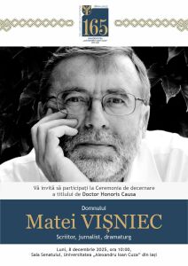 Ceremonia de decernare a titlului de Doctor Honoris Causa al UAIC domnului Matei Vișniec, scriitor, jurnalist și dramaturg va avea loc luni, 8 decembrie 2025, la ora 10:00, în Sala Senatului