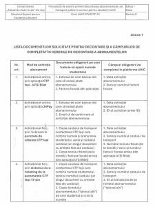 | 4 | Achiziționat fizic, prin sistemul de e-ticketing de la automatele CTP Iași / E-pin | 1. Copia cardului de transport contactless CTP Iași care conține numele studentului, seria și numărul cardului 2. Copia tichetului abonamentui (”talonul alb”) pe care studentul și-a scris numele |